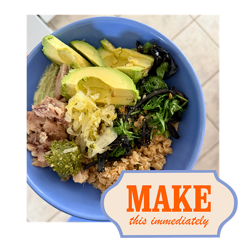🥣 Savory Oatmeal: I’ve been making this for lunch every day since I’ve been home and I truly can’t get enough. After cooking these sprouted oats in chicken broth, I top them with mushrooms sautéed with greens and onions or leeks, and add a protein like a soft-boiled egg or salmon, plus some sauerkraut. Before eating, I top it with this mushroom oil (an L.A. Erewhon find I’m obsessed with). It is so good.