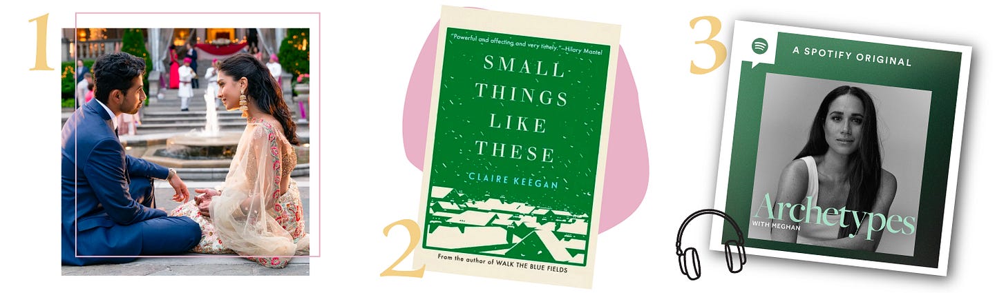 🎥 Wedding Season on Netflix: Fight me on this, but the best romcom plot is: two people who are obviously perfect for each other decide they cannot be together, but need to pretend to be together for XYZ reasons, then (WHAT!?) end up falling in love. In this iteration of the age-old tale, Asha and Ravi are set up by their parents and, at Asha’s insistence, agree to pretend to be together to remove the pressure they’re each facing from their respective families to find a match during wedding season. Tropes abound: We know Ravi is a cool girl because she eats double cheese-burgers and a professional lady because she brings file folders and her Macbook to weddings. Is it a brilliant movie? No. Did my friend and I eat up every second of the low-stakes drama and cute outfits Asha wears when we watched it this weekend? Absolutely.