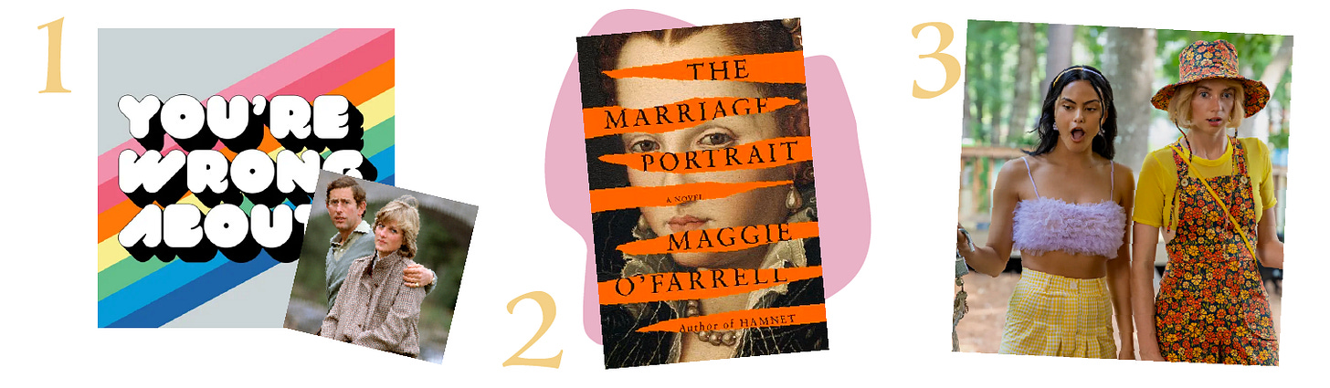 🎧 Princess Diana 5-Part Series on “You’re Wrong About:” It has come to my attention that I’m going through a bit of a royals phase this week (…aren’t we all?), which co-host Mike Hobbes legitimized when he said, “It’s just really nice to be listening to royal gossip from twenty-five years ago.” Same, Mike. While I recognize the gravity in that these are real lives and real people, I am also all too happy to escape into King Charles’s war on pens, Meghan’s feature from her Montecito estate and podcast (loved this episode), and Charles’s long-ago leaked sexy phone calls to Camilla, which is the exact hole this five-part series fills. Mike (who also co-hosts the fantastic podcast “Maintenance Phase”) and his co-host Sarah Marshall’s rapport is hilarious, as is the low-stakes drama. 10/10 recommend roping your friends into listening with you, although your group text will be taken over by it. (Another good Diana podcast is “When Diana Met…” if you’ve already listened to this one!).