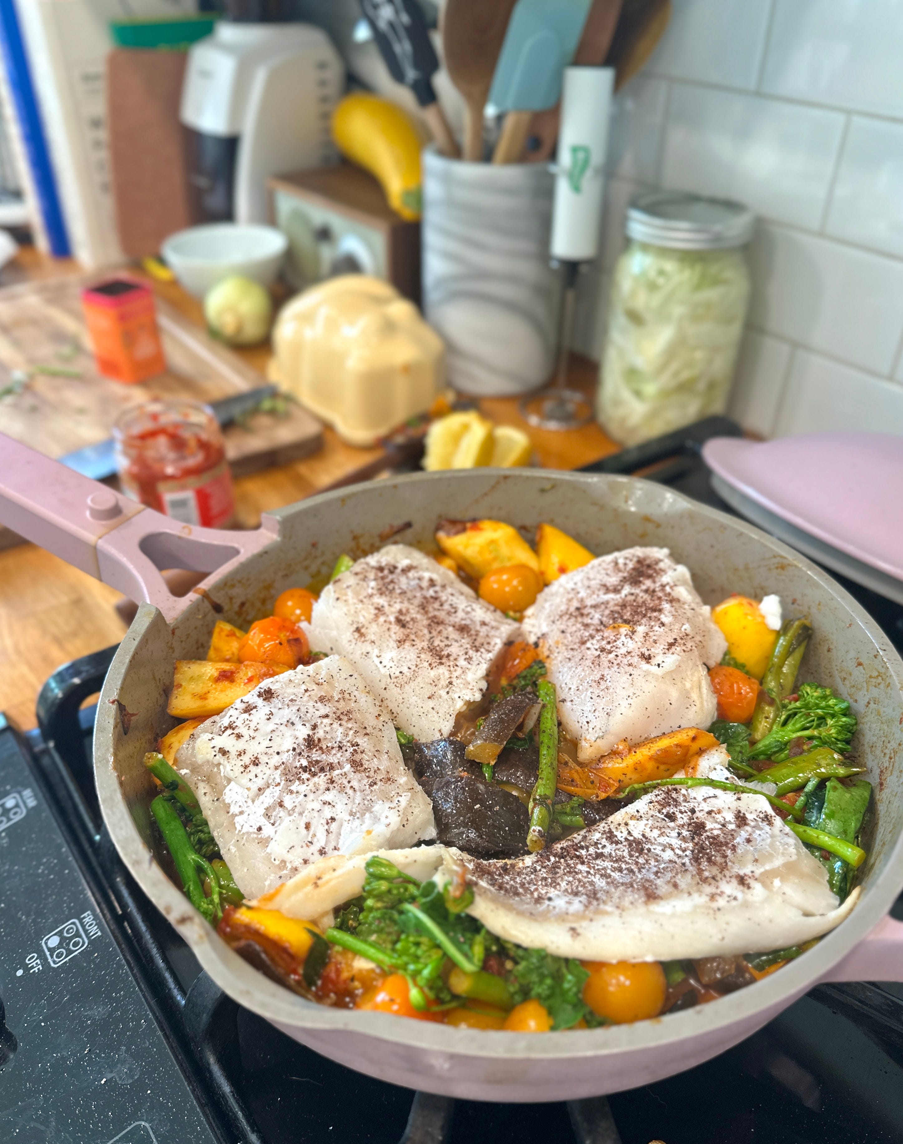 This recipe, like most I create, emerged out of necessity. I had a countertop full of vegetables from my garden that needed to be used up before a weekend trip, and didn’t want to dirty more than one pan, so I made a ratatouille-adjacent blend of eggplant, zukes, and cherry tomatoes, cooked in Moroccan spices like harissa and sumac, then added cod which steams directly on top of the flavorful vegetables. The whole thing takes about 30 minutes to make, including prep, and is delicious and impactful considering how little effort it takes!