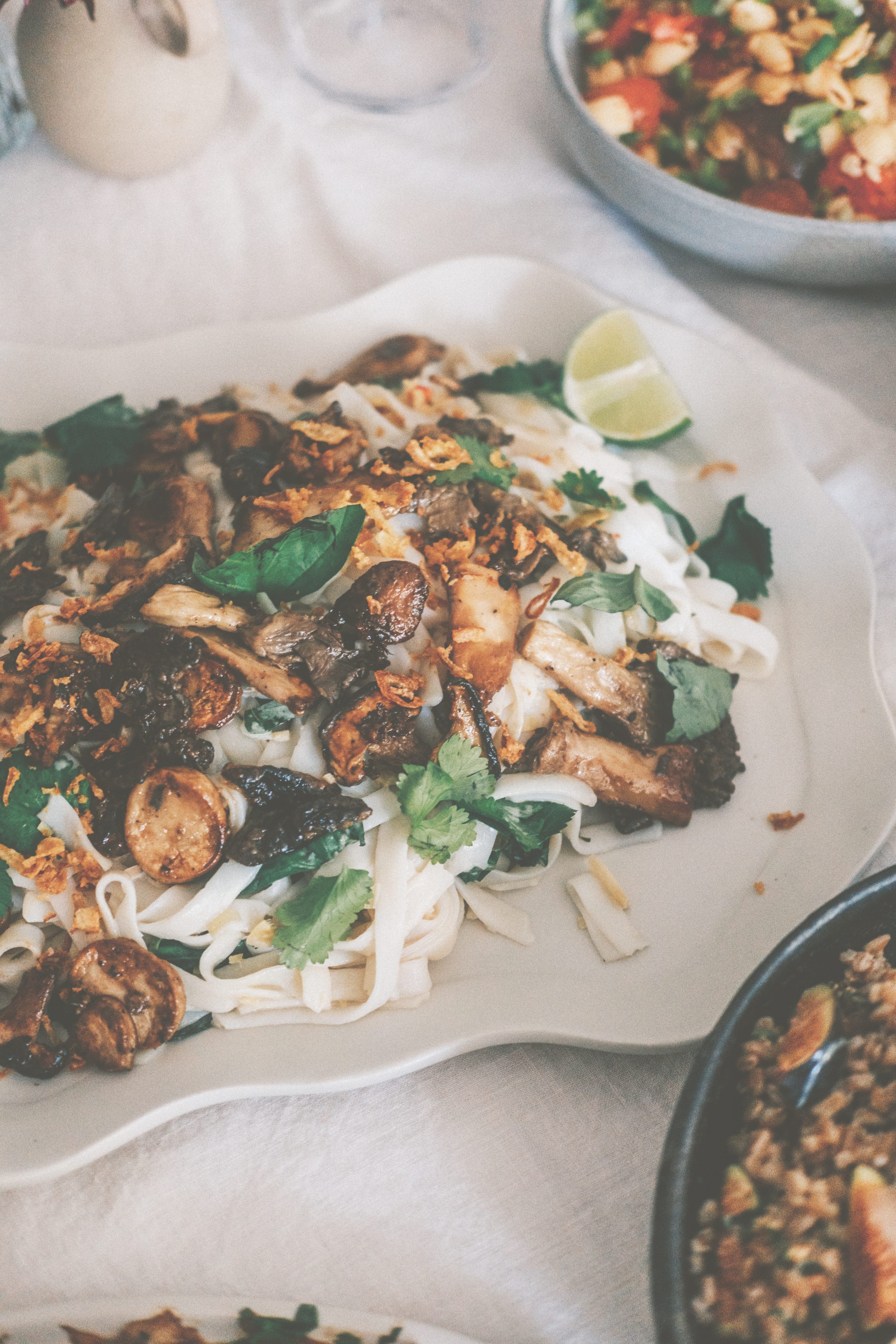 To serve, place the noodles in a large serving bowl. Add the coconut dressing and the basil and toss well. Taste and add more salt if needed. Top with the seared mushrooms and crispy fried shallots and serve with lime wedges on the side.