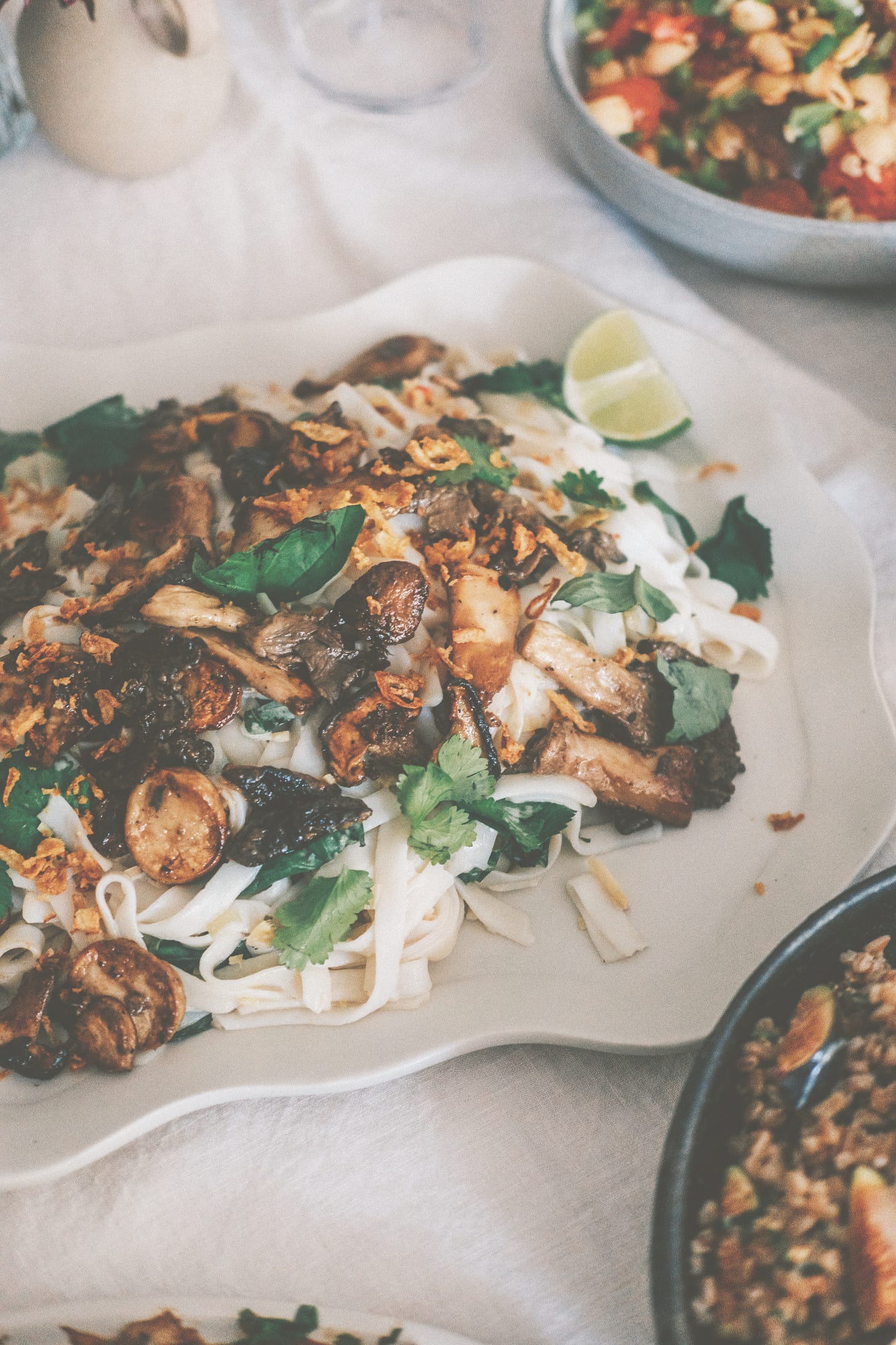 Her latest cookbook Linger, centers creative salads, but also sweets and snacks, that are perfect for entertaining. In flipping through her cookbook, it was almost impossible to select just one recipe to share with you—but her Tom Kha Noodle Salad with Seared Mushrooms is something special. I’ll let Hetty take it from here: